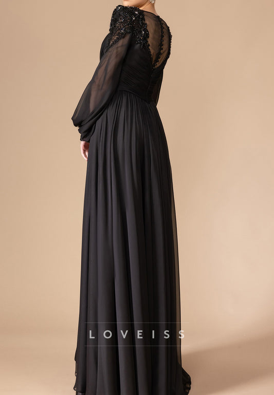 V-Neck Long Sleeves Pleated Beaded A-Line Evening Dress