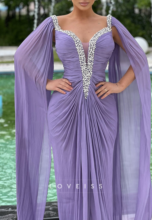 V-Neck Long Sleeves Pleated Beaded Sheath Evening Dress