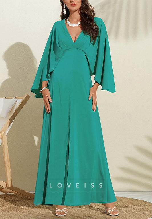 V-Neck Long Sleeves Pleated A-Line Formal Dress