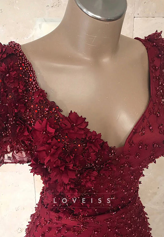 V-Neck Short Sleeves Appliques Beaded Embroidery Mermaid Evening Dress
