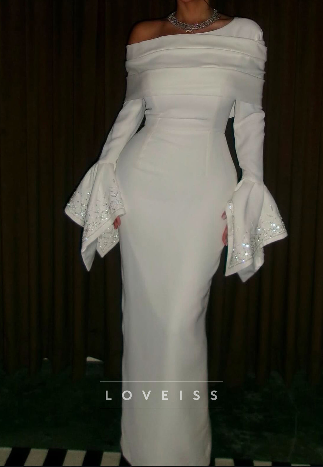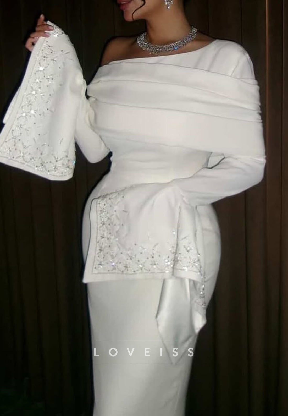Asymmetrical Long Sleeves Beaded Sleek Mermaid Evening Dress