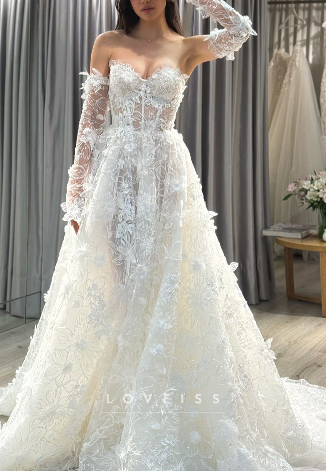 This A-line wedding dress exemplifies refined bridal design with its sweetheart neckline and intricate floral embellishments. The silhouette flatters diverse body types while the detailed beadwork and floral accents add dimensional texture and visual interest. Paired with coordinating gloves, this ensemble creates a cohesive, polished bridal look. The A-line cut provides comfortable movement without sacrificing elegance, making it an ideal choice for brides who prioritize both aesthetic appeal and wearability on their wedding day.