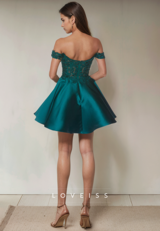 A Line Off Shoulder Satin Lace Appliques Cute Homecoming Dress Short Graduation Dress