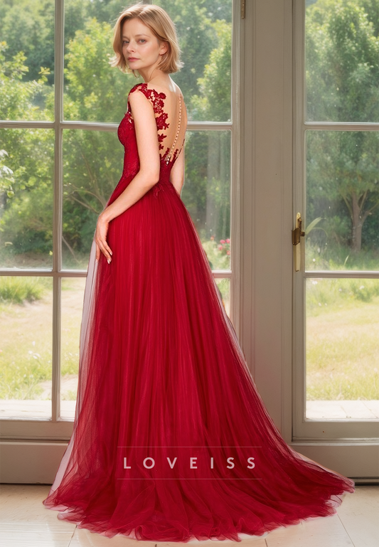 V-Neck Sleeveless Lace Appliques Tulle A-Line Prom Dress