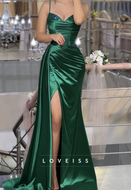 V-Neck Spaghetti Straps Seequins Pleated Side Slit Sheath Evening Dress