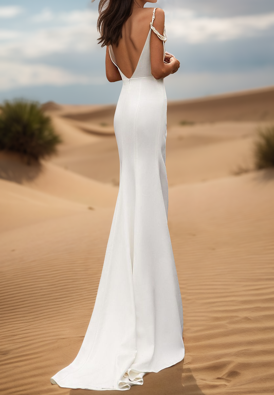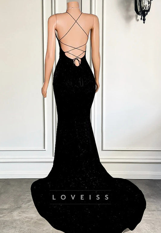V-Neck Spaghetti Straps Open Back Sleek Mermaid Evening Dress