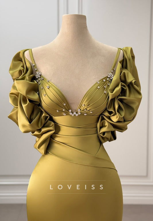 V-Neck Spaghetti Straps Pleated Beaded Sleek Evening Dress Mermaid Formal Dress