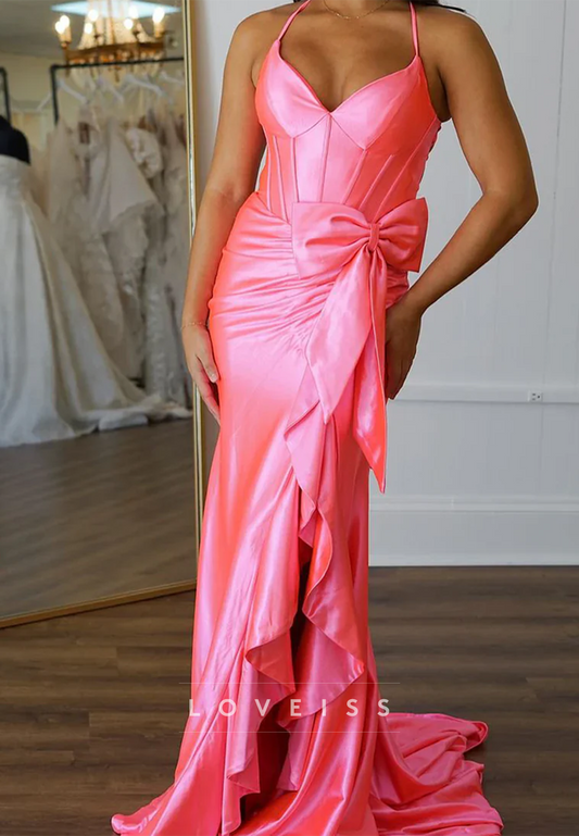 V-Neck Spaghetti Straps Ruffled Bowknot Sheath Prom Dress