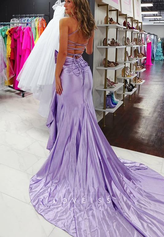 V-Neck Spaghetti Straps Ruched High Slit Illusion Mermaid Prom Dress