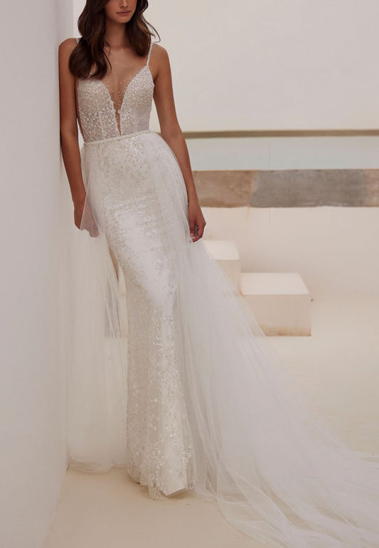 V-Neck Spaghetti Straps Sequins High Slit Sheath Beach Wedding Dress