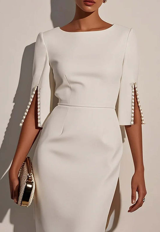 White Imitation Pearls Classic Crew Neck Half Sleeve Sheath Midi Dress