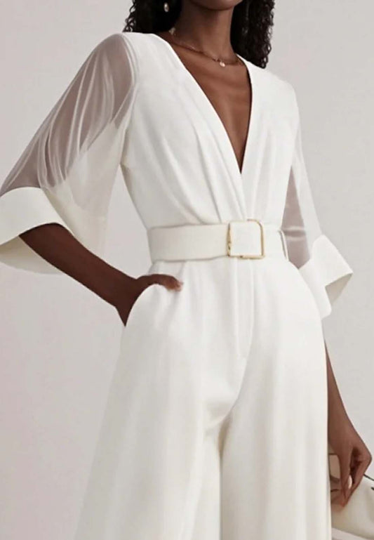 White Mesh V Neck Half Sleeve Plain Wide-Leg Jumpsuit With Belt