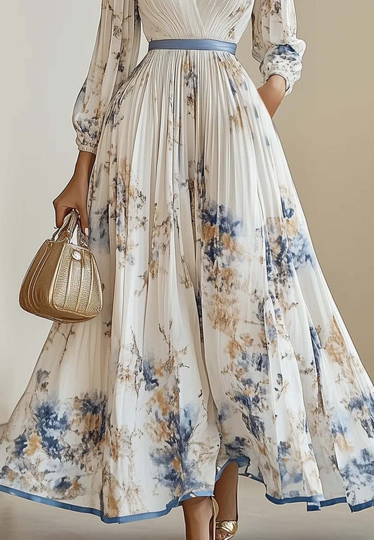 White Pleated Chiffon V Neck Floral Long Sleeve Balloon Sleeve A-Line Maxi Dress