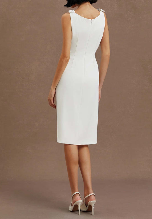 White Imitation Pearls Knot Front Classic Boat Neck Short Sleeve Sheath Midi Dress