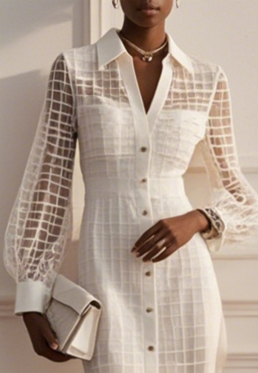 White Shirt Dress Shirt Collar Long Sleeve Balloon Sleeve Sheath Midi Dress