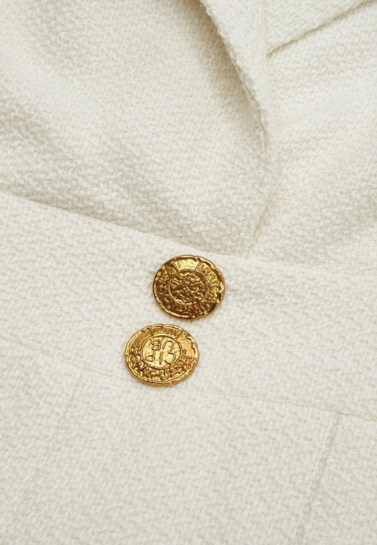 White Tweed Buckle Pocket Stitching Lapel Collar Wide-Leg Jumpsuit