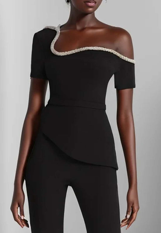 Women Black Asymmetrical Rheinstone Wide-Leg Jumpsuit