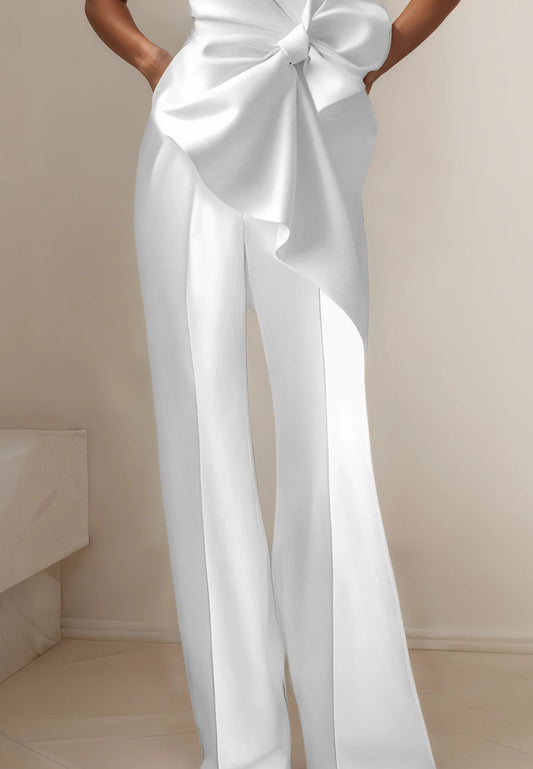 Women White Boat Neck Sleeveless Bow Wide-Leg Jumpsuit