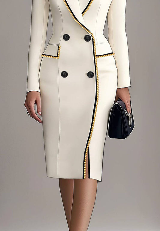 Work Business Blazer Dress Lapel Pearl Long Sleeve Midi Dress