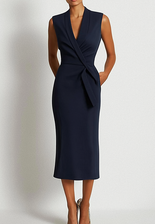 Work Business Dark Blue Dress Sleeveless Pencil V-Neck Sheath Midi Dres