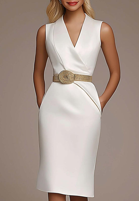 Work Dress White Satin Cross Neck Sleeveless Pocket Knee-Length Dress