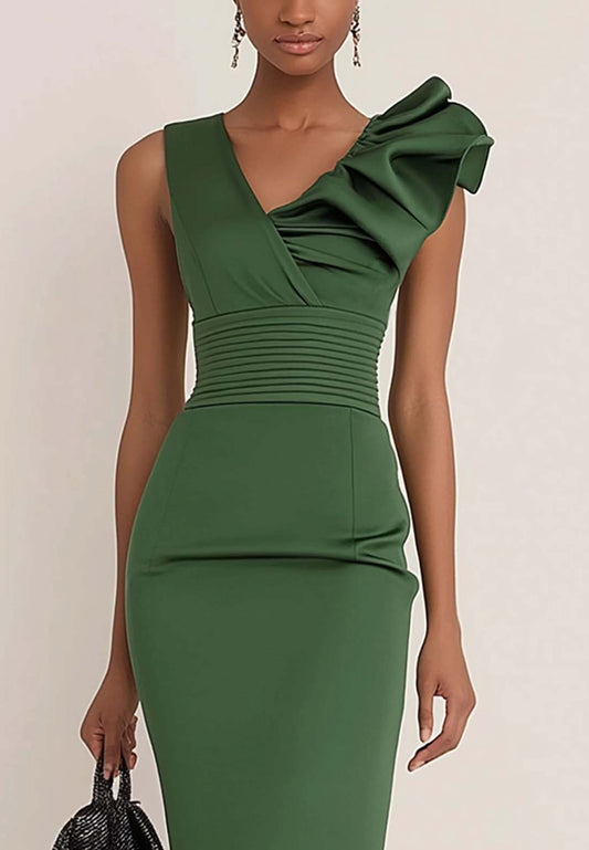 Work Semi-Formal Dress Green Sleeveless Ruffle Fitted Midi Dress