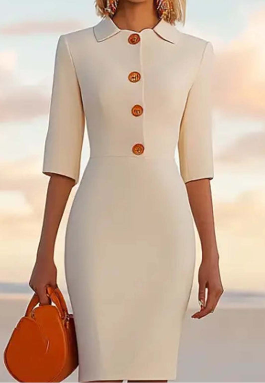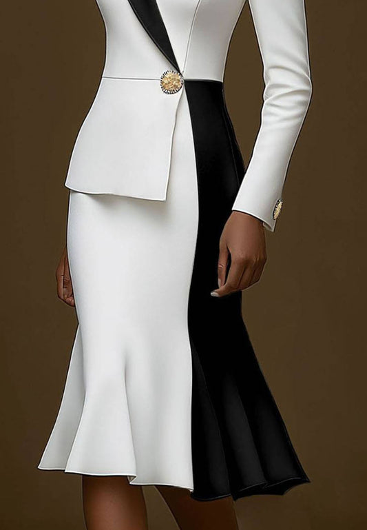 Work Semi-Formal White Dress Long Sleeve Bottoned Lapel Midi Dress