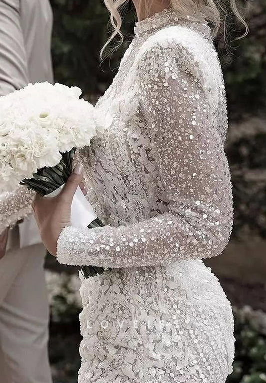 High Neck Long Sleeves Beaded Embroidery Appliques Sheath Wedding Dress