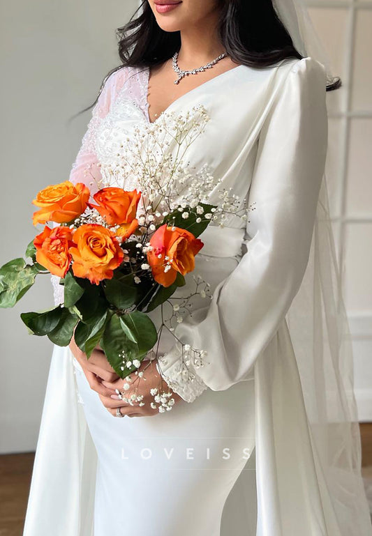 V-Neck Long Sleeves Beading Pleated Mermaid Wedding Dress