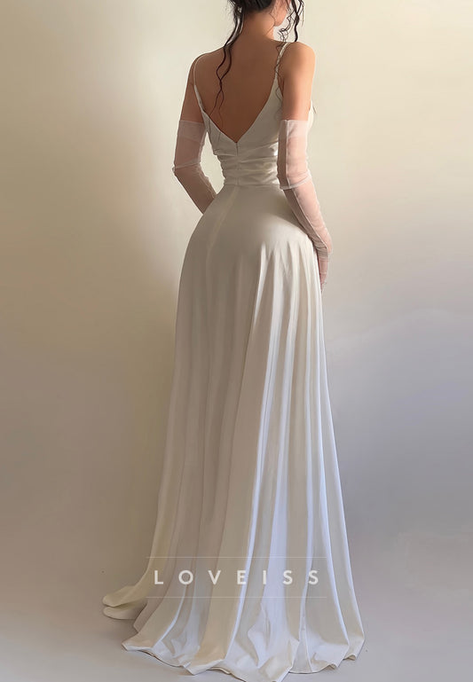 V-Neck Spaghetti Straps Side Slit Sleek Sheath Wedding Dress