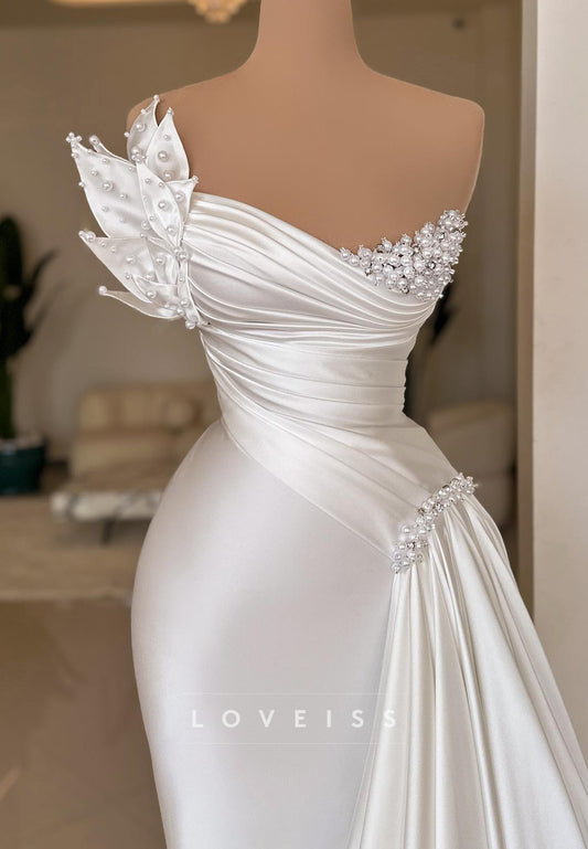 Asymmetrical Pleated Sheath Sleek Beaded Wedding Dress