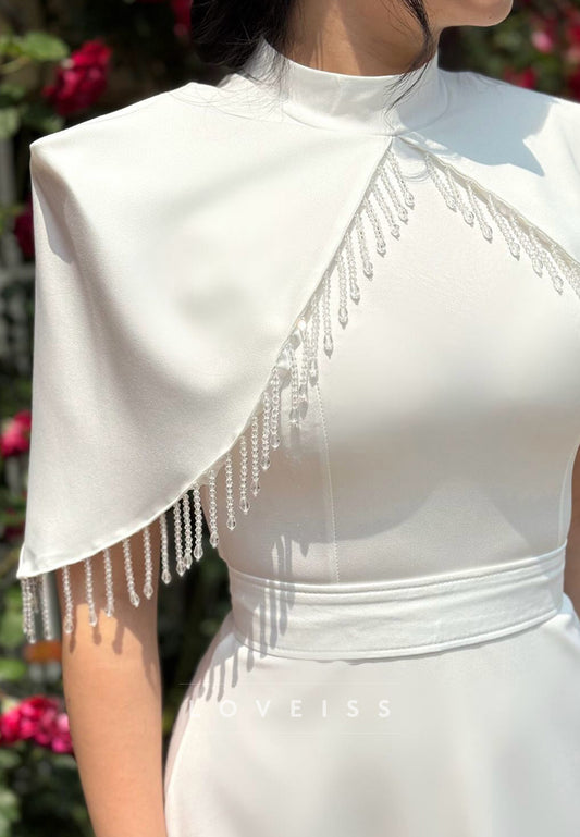 High Neck Short Sleeves Sleek Sheath Wedding Dress