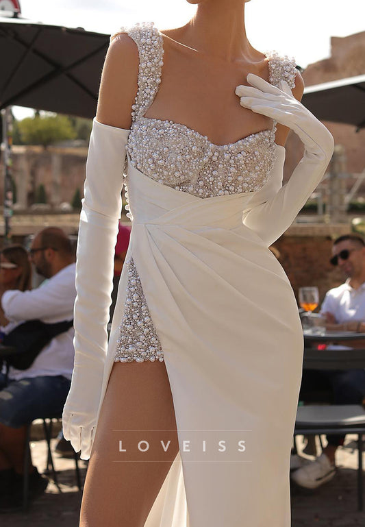 Sweetheart Straps Pearl Beaded Sheath Beach Wedding Dress