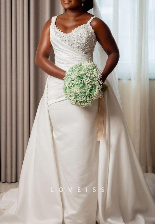 V-Neck Sleeveless Pearl Beaded Sheath Wedding Dress