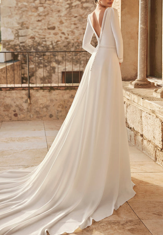 Square Long Sleeves Sleek Pleated A-Line Classic Wedding Dress