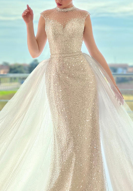 High Neck Cap Sleeves Beaded Sleek Mermaid Wedding Dress