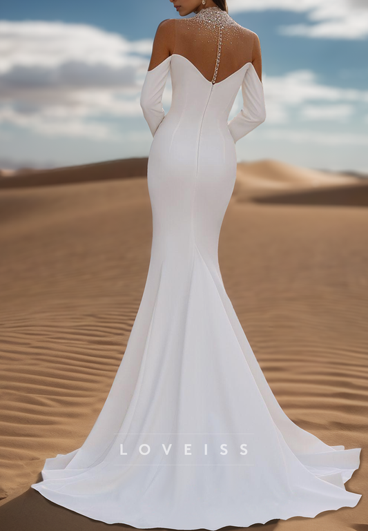 High Neck Long Sleeves Beaded Mermaid Wedding Dress