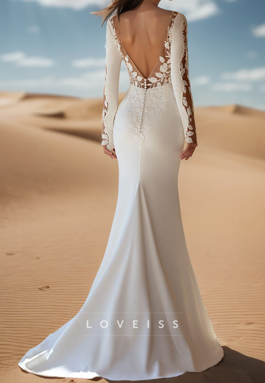 Scoop Long Sleeves Appliques Sleek Mermaid Wedding Dress