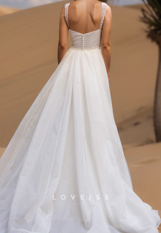 V-Neck Straps Appliques Tulle A-Line Beach Wedding Dress