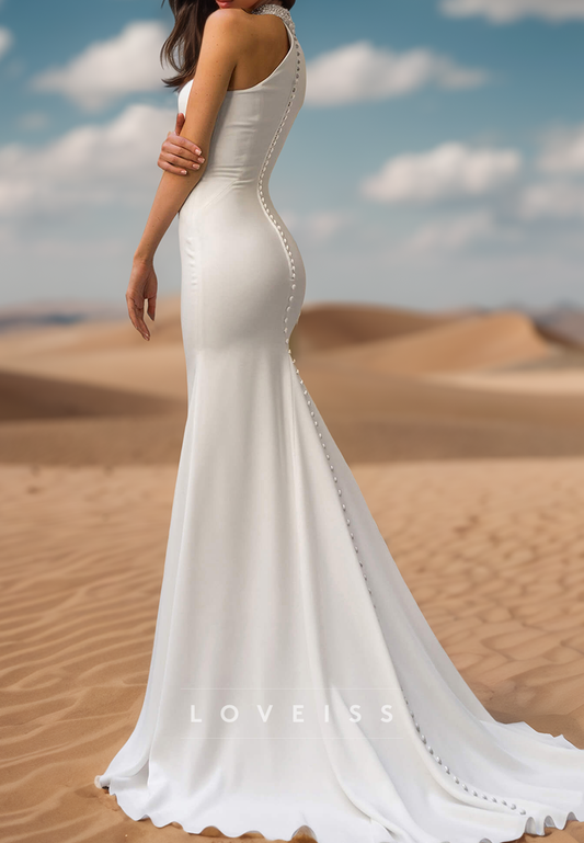 V-Neck Straps Backless Sleek Mermaid Beach Wedding Dress