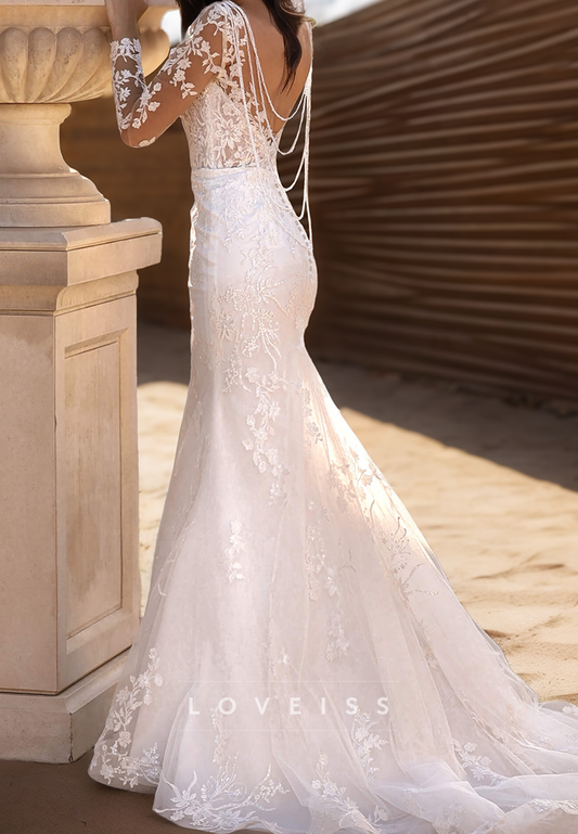 V-Neck Long Sleeves Sleek Beaded Mermaid Wedding Dress