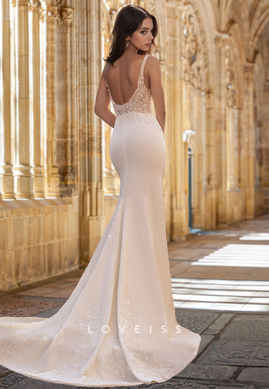 V-Neck Straps Lace Appliques Sleek Mermaid Wedding Dress