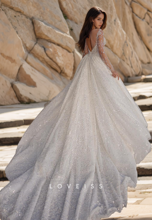 V-Neck Sleeveless Tulle High Slit Sparkly A-Line Wedding Dress