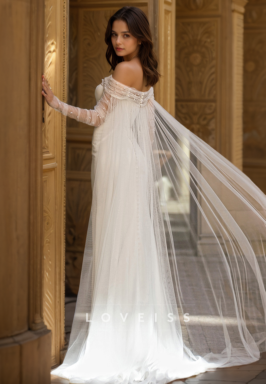 Off-Shoulder Long Sleeves Sparkly Tulle Side Slit A-Line Beach Wedding Dress