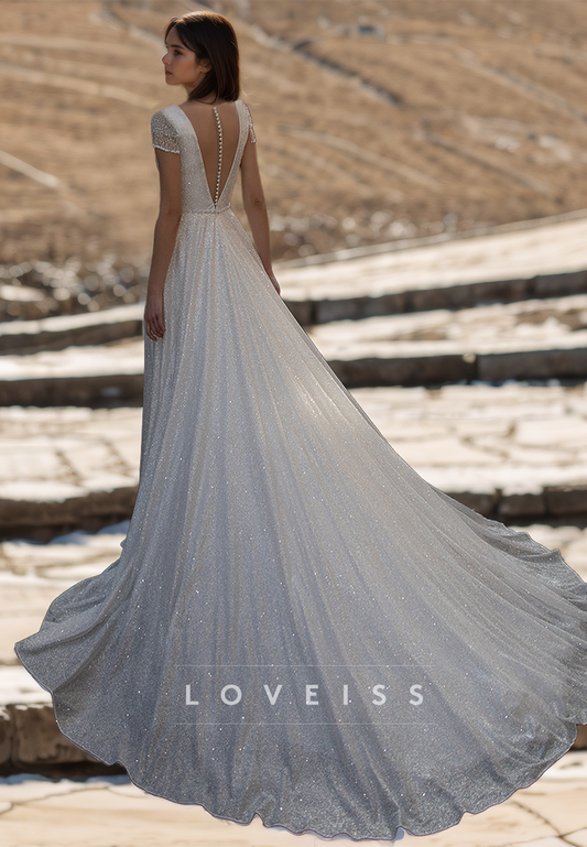 V-Neck Cap Sleeves Beaded Tulle A-Line Sparkly Wedding Dress