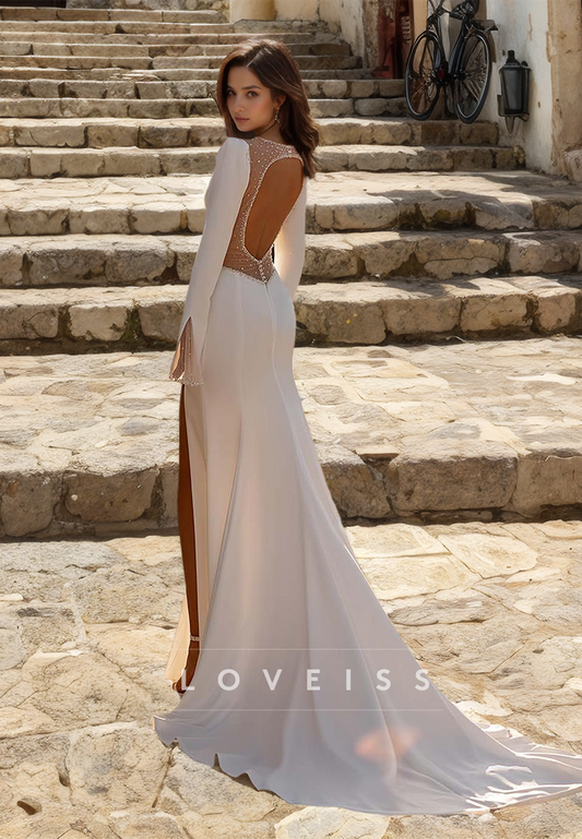 V-Neck Long Sleeves Pleated Side Slit Backless Sheath Beach Wedding Dress