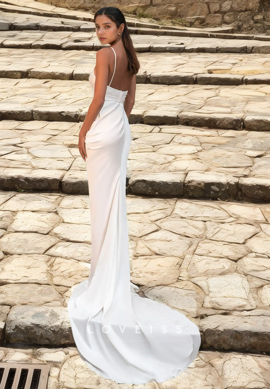 V-Neck Spaghetti Straps Ruched High Slit Sheath Beach Wedding Dress