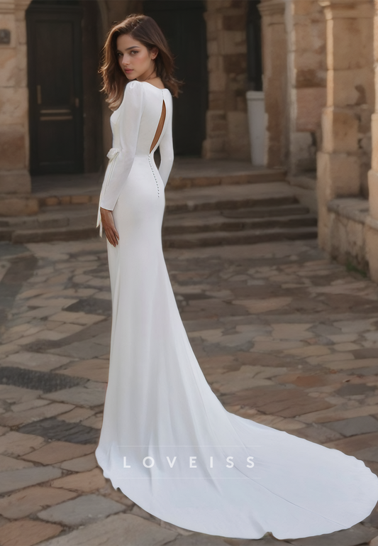 Bateau Long Sleeves Sleek Appliques Sheath Wedding Dress
