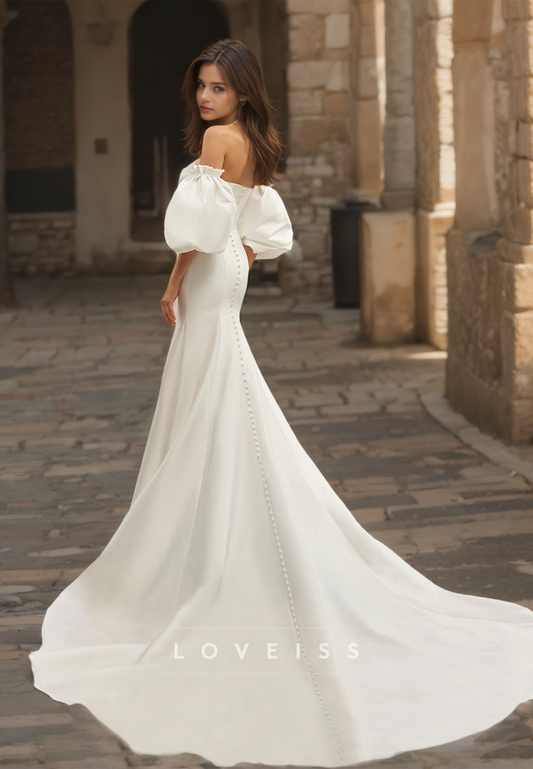 Straight Across Puff Sleeves Sleek Mermiad Wedding Dress