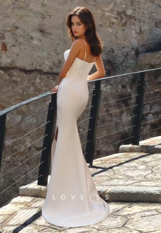 Sweetheart Spaghetti Straps Pleated Side Slit Sleek Sheath Beach Wedding Dress